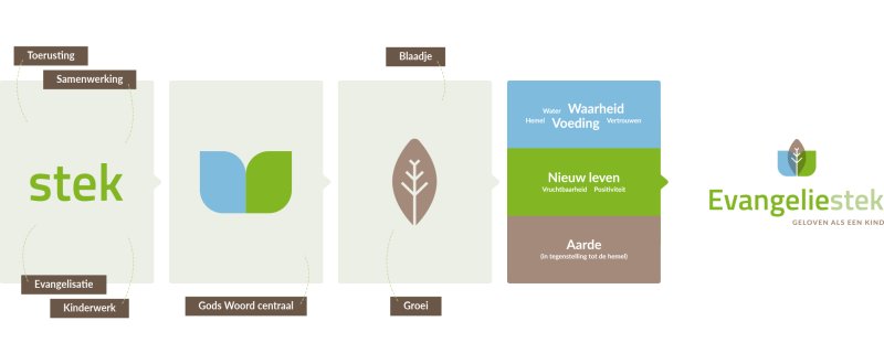 Een jong plantje heeft vanaf het poten van het zaadje aandacht, licht zorg en voeding nodig om te kunnen groeien. Om verder te groeien moet er blijvend aandacht gegeven worden. Het is de wens van Evangeliestek dat Gods Koninkrijk uitgebreid wordt onder kinderen en jongeren die nog niet in aanraking zijn gekomen met het Evangelie. Het Evangelie verspreiden, waarin verteld wordt over de vergeving van zonden en redding voor het eeuwige leven. Het blaadje wijst naar boven.